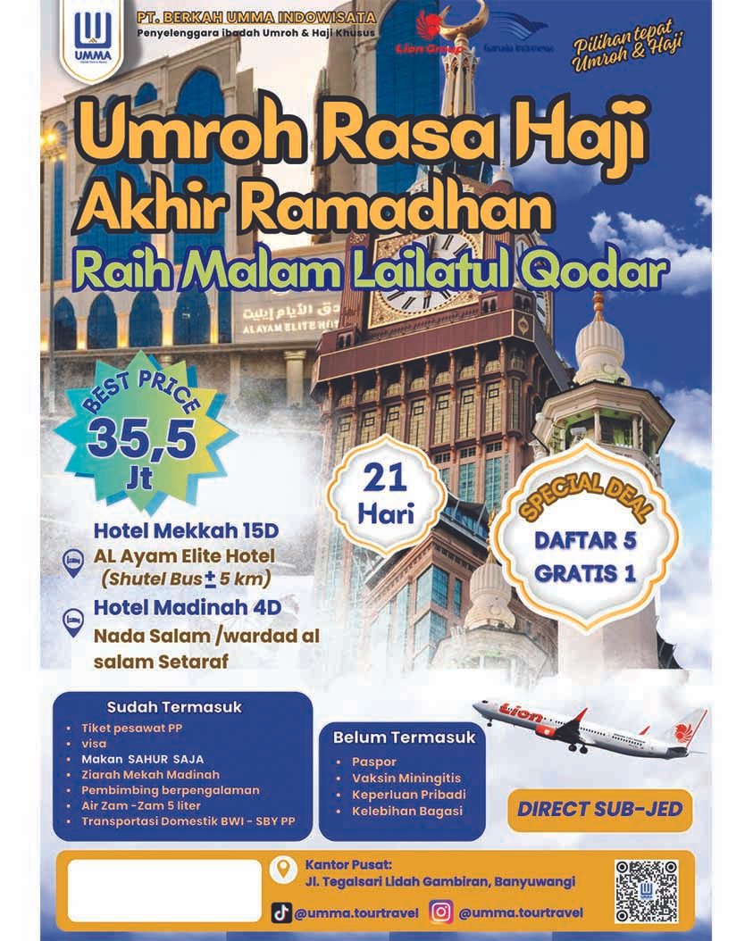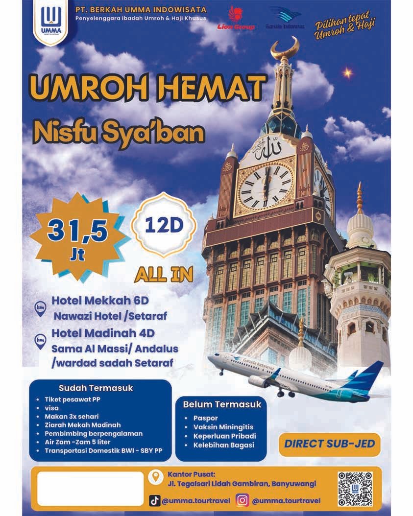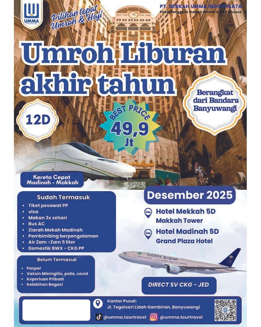 UMMA TOUR TRAVEL melayani keberangkatan jamaah umroh dan haji dengan bimbingan profesional, resmi, dan berpengalaman untuk warga Banyuwangi & Jawa Timur.